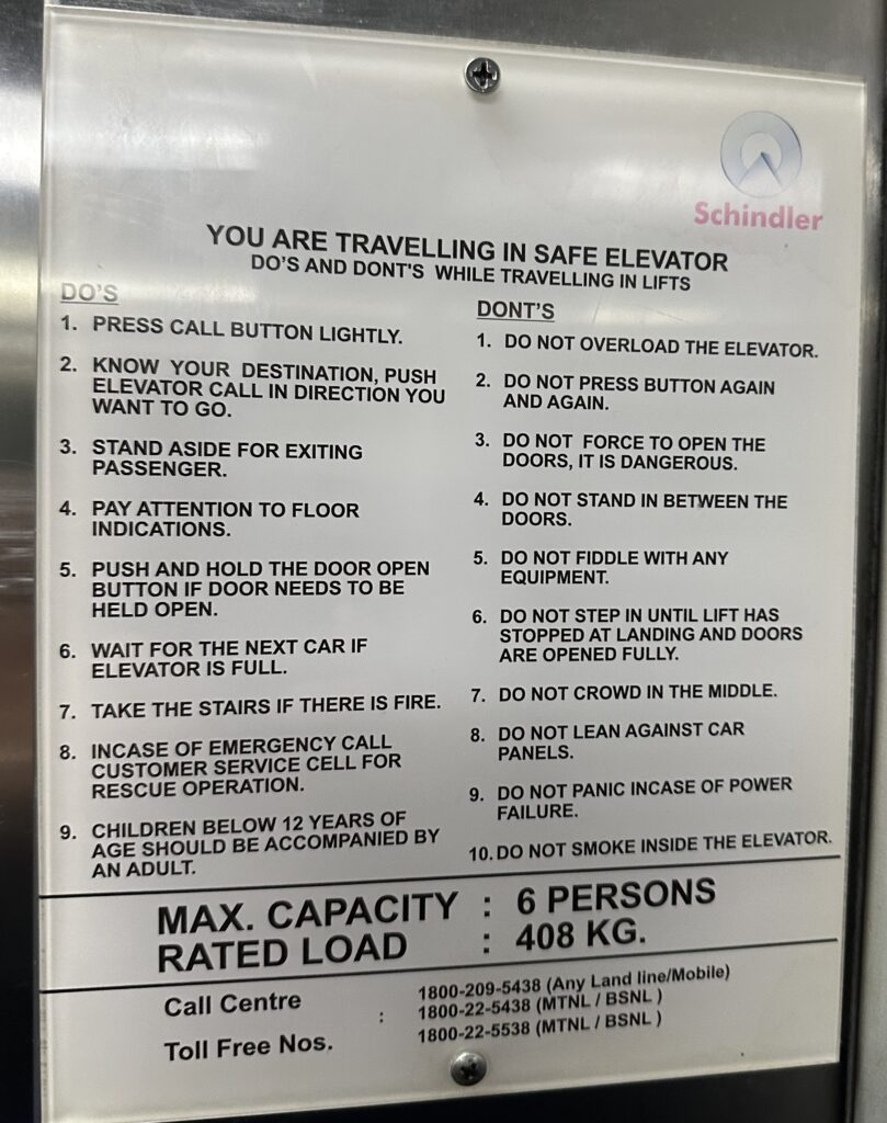 As I selected my floor in the hotel elevator some culturally interesting comments were posted. Like “Do not fiddle with any equipment.” And “Do not press button again and again.” Lucky I read them, as I was about to fiddle, again and again.