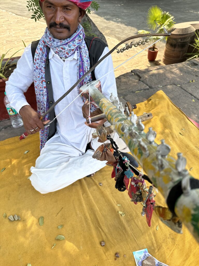 On the way we passed a man playing a single stringed instrument called a ravanhattha, an ancient bowed, stringed device originating in India. It is widely considered one of the oldest stringed musical instruments in the world and is often cited as a likely ancestor of the violin. The man was playing with a curved bow, with small bells attached, drawing it across the strings.