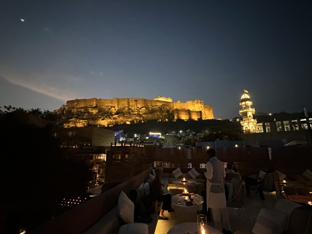 That night we went to a high end dining spot in the Walled City Hotel. It was on an open roof again looking at the Mehrangarh Fort hovering in the distance. While we ordered drinks we listened to, and rated, the sunset “call to prayer”. This muezzin was rated 6.5 out of 10 on the Powell adhan prayer rating system. He should have been better, for he does do it five times a day. Delicious meal: I had tandoori lobster, and an excellent Killibinbin Chardonnay.