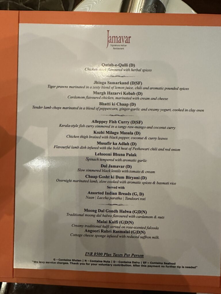 I then took Brendan out to a high end restaurant called Jamavar, for what turned out to be a superb meal. (Their sister restaurant in London has a Michelin star.) It was for his recent birthday, and of course we ordered what they recommended as their signature meal.
