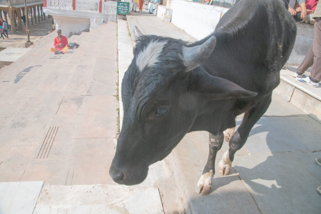 Dylan and I were accosted by another intense believer, and he really wanted to have us listen to him about the fact that Hindus consider a journey to Pushkar to be the ultimate pilgrimage that must be undertaken to attain salvation. I have a video of Dylan talking to him about “the holy water coming from the ground”, all the while a large, black cow is edging its massive way by me.