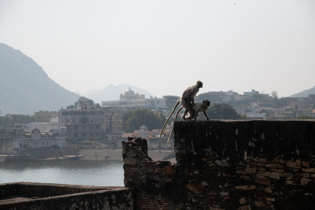 One amusing incident I duly captured with my long lens was two langurs (slender, long-tailed Old World monkeys) who ran across a retaining wall and in a mid-stage performance, with a domed temple in the background, screwed quite enthusiastically and then ran off. Take that, you temples.