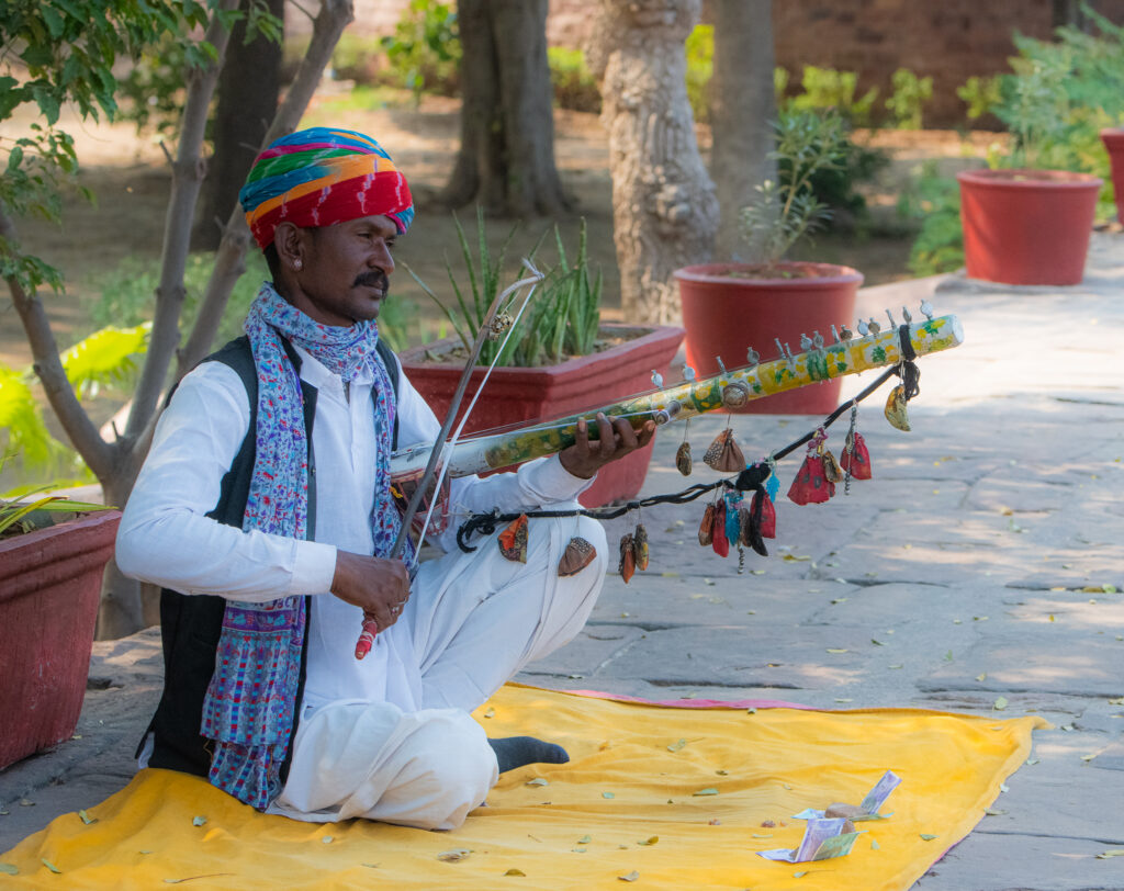 Once in Jodhpur, the evening meal on the top of our hotel, the Kankariya Heritage, presented a stunning sunset dipping below the edge of the Mehrangarh Fort, where we would tour tomorrow afternoon. As we ate dinner we listened to four musicians play and sing. They were terrific and enthusiastic. One worked hard on a harmonium that sat on the floor, and one played a small yow-headed drum called a dholak; another chap played hand-held castanets.