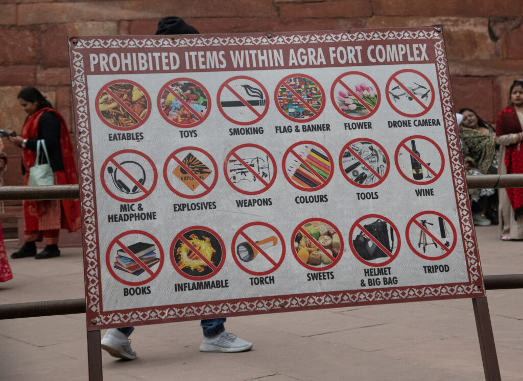 India tends to excess with respect to instructions and bureaucracy. Here are two examples at the same place. A sign listing “prohibited/banned items within the Agra Fort premises” and another with pictures for emphasis!