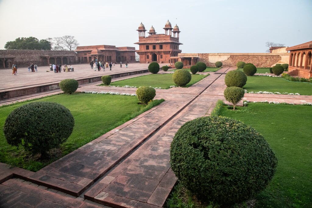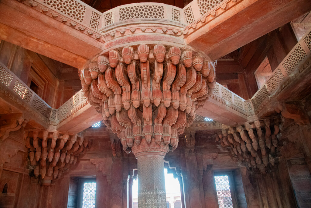 There are a number of impressive monuments in this place: a vast mosque containing a tomb; a delicate white marble structure; a small, screened structure intended for royal women; the Hall of Private Audience, which was built by Akbar, featuring a central pillar topped with a large carved capital that supports a walkway; the Palace of Jodha Bai, which is the largest and most important building of the Imperial residential complex named after Akbar’s Hindu Rajput wife, which has richly carved interior pillars, balconies, perforated stone windows, and an azure-blue ribbed roof on the north and south sides; and a large, open pavilion where the emperor met the public.