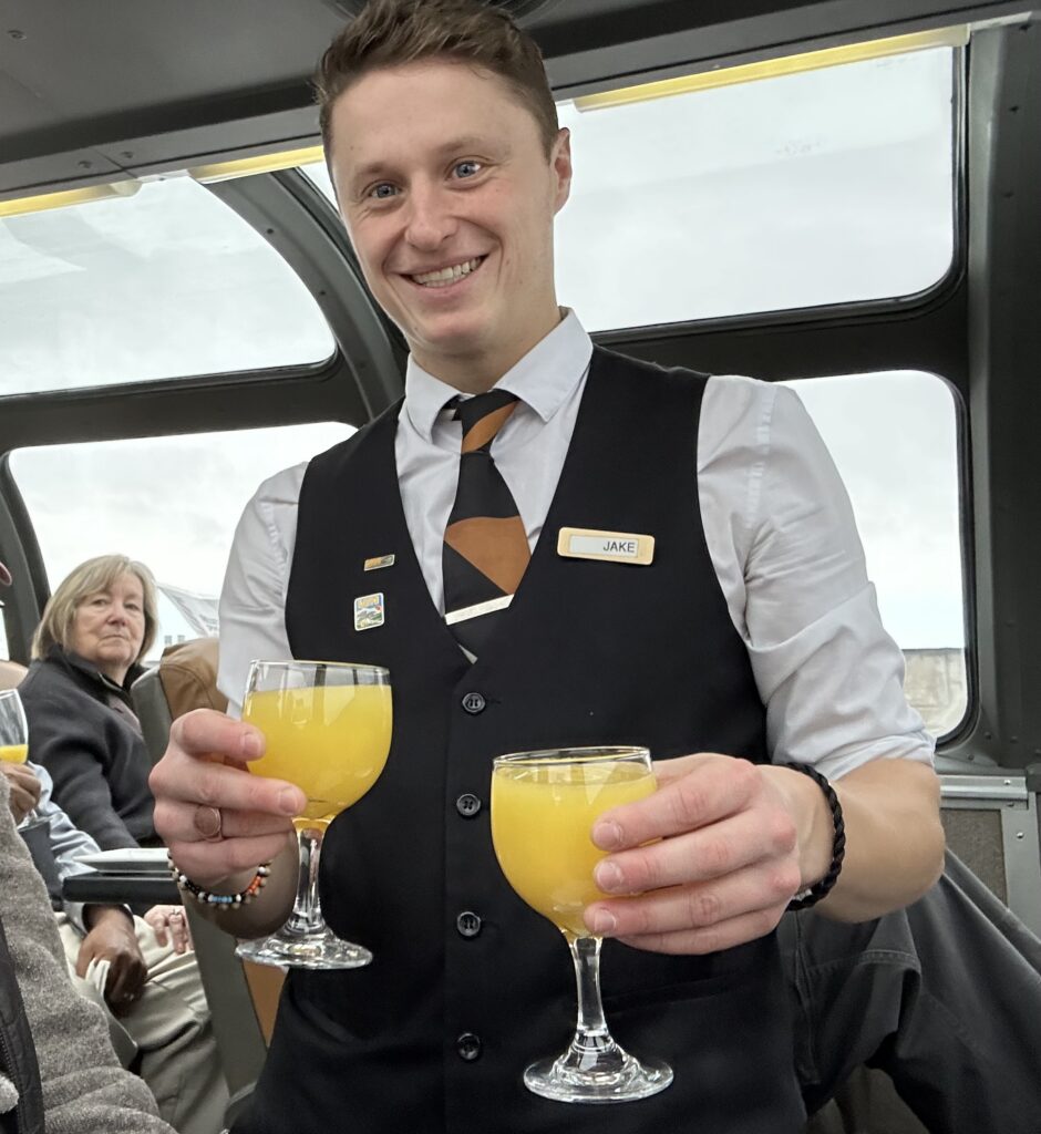 Within the train, we were well served and I’ll explain how. But on top of this was the reality that we were being being pulled by two mammoth engines lumbering along on two rails. The feeling it generated – a gentle mesmerizing motion that’s rhythmic – was almost hypnotic.
