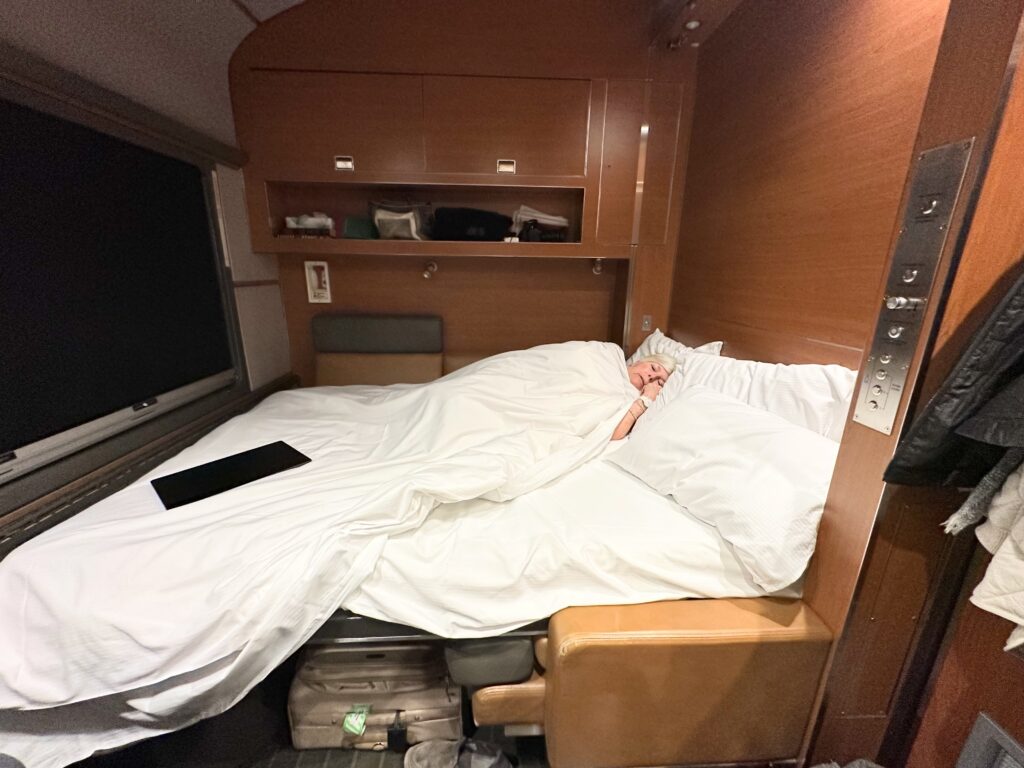 We had reserved quite comfortable accommodation, called the Prestige Sleeper cabin. (It is 50% larger than their cabin for two in Sleeper Plus class.) It featured an extra-large window and its own private washroom with shower. A modular leather L‐shaped couch transformed at night into a Murphy bed for two facing the window. There were eight of them on the train. It was a good decision.