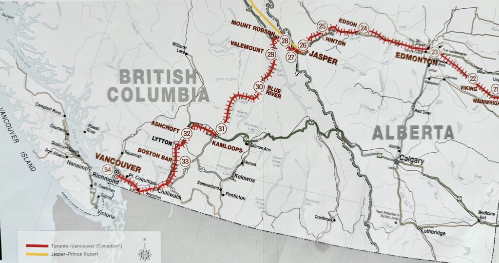 The train was late into Edmonton and arrived around midnight. It stayed for a few hours, but we hit the sack. This map shows the Alberta, then BC route.