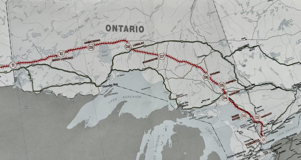 Around noon the first day they had already served margaritas, for goodness sake, while we were in the dome car, after which they briefly stopped at Sioux Lookout. We’d come over 1600 kms.